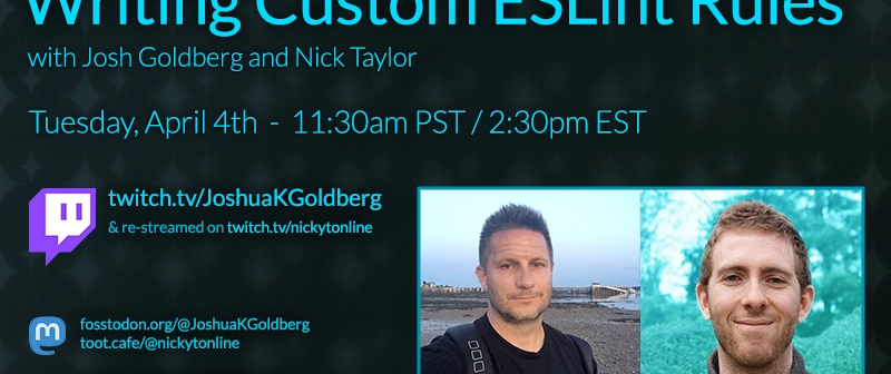 I’m going to be hanging with @joshuakgoldberg on their stream this Tuesday. We’re going to be building out some custom ESLint rules to learn more about how ESLint works under the hood.